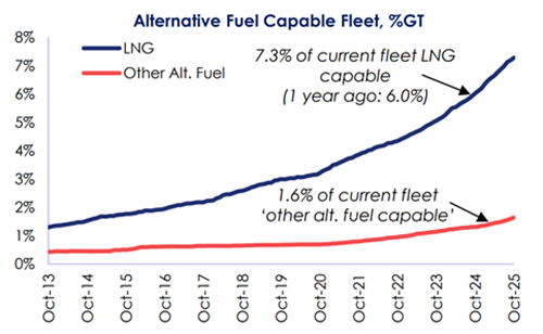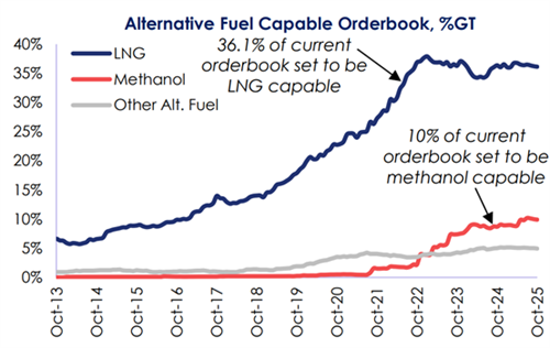根据克拉克森的数据,整体而言按吨位计算,截至目前在运营船队中能够使用替代燃料或推进装置船舶的比例已经提高到了8.9%,高于2017年的2.6%和2024年年初的6.5%。在现有总计2605艘替代燃料船舶中,包括1490艘LNG动力船、81艘甲醇动力船、147艘LPG动力船、760艘电池/混合动力推进船,此外还有285艘采用其他燃料。