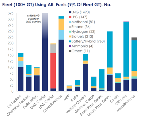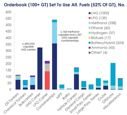 今年的替代燃料船舶订单包括LNG动力船158艘2110万总吨,甲醇动力船54艘620万总吨,LPG动力船16艘70万总吨,乙烷动力船4艘10万总吨,以及电池/混合动力推进船舶110艘150万总吨。